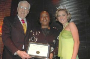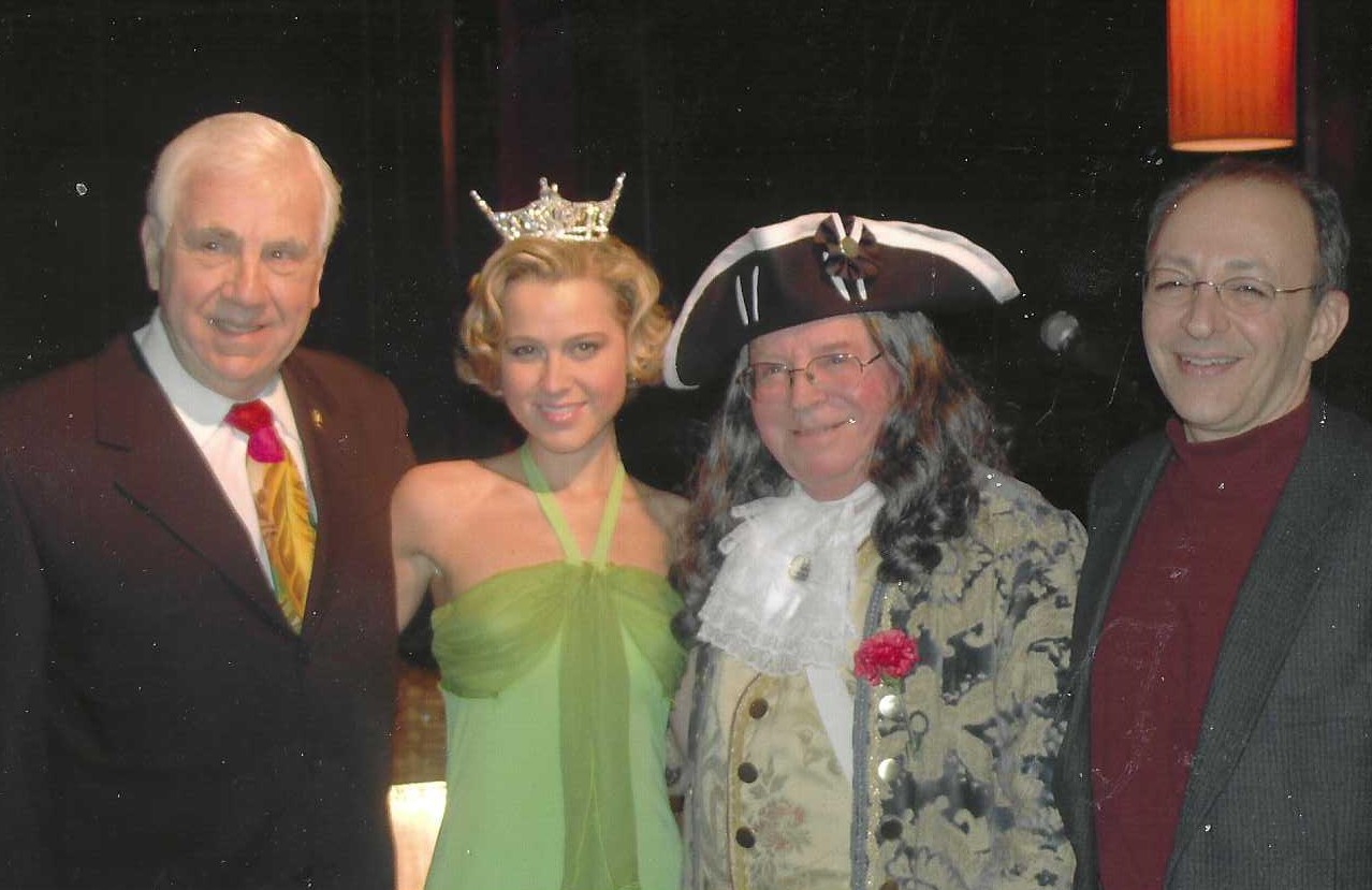 Ron Della Chiesa (L) presdents Muse Awards to Marie Coviello (M) and Ms. Massachusetts (R)